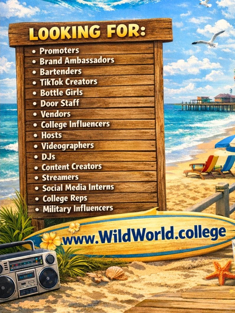 We are looking for promoters, brand ambassadors, bartenders, TikTok creators, bottle girls, door staff, vendors, college influencers, hosts, videographers, DJs, content creators, streamers, social media interns, college reps, and military influencers. Join the team and be part of the action from March 7 - 16!